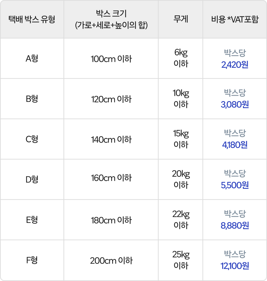 재고가 담긴 택배 박스의 크기와 무게에 따라서 A-F 유형으로 분류되어 비용이 부과됩니다. 박스 크기와 무게 둘 중 어느 하나라도 초과 된다면, 상위 유형으로 분류됩니다.